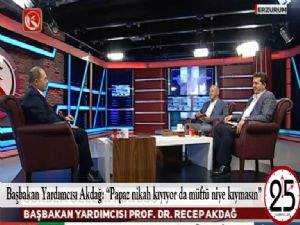 Başbakan Yardımcısı Prof. Dr. Recep Akdağ, Kardelen TV'deki "Gündem Özel" programına konuk oldu. İHA Erzurum Bölge Müdürü Ayhan Türkez ve Gazeteci Esat Bindesen'in sorularını cevaplandıran Akdağ, müftülere nikah kıyma yetkisine tepki gösterenlere cevap verdi. Kimseye zorla bir şey yaptırılmadığını ifade eden Akdağ, "Kimseyi müftüye git nikah kıydır diye zorlayan bir kanun yok. Mevcut sistem zaten devam ediyor ama arzu edenler müftüye de kıydırabilecekler. Bu vatandaşın işini kolaylaştırıyor. Bu aslında nikah memurları ve belediye başkanının da işini kolaylaştırıyor. Özellikle yaz mevsimlerinde garibim evlendirme memurları ve belediye başkanları beş dakika oturamıyor, o salondan öbür salona koştur dur. Yani ne gereği var?" dedi.