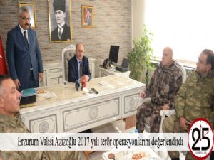 Erzurum ili dahilinde, 2017 yılının Emniyet, MİT, Jandarma ve Silahlı Kuvvetlerinin çalışmaları neticesinde huzur içerisinde geçtiğini belirten Vali Azizoğlu, "Yapılan çalışmalar ile vatandaşlarımızın huzur ve güvenliğini tehdit eden teröristlerin ele geçirilmesi yanında, terörü destekleyen milis alt yapısının ve terörün ekonomik kaynaklarının çökertilmesi hedeflenmiştir. Bu maksatla, 2017 yılında 24 saat esasına göre icra edilen bin 200 operasyonda, ikisi yeşil ve gri listede aranan sorumlu düzeyde olmak üzere toplam beş terörist etkisiz hale getirilmiştir. Buna ilave olarak Erzurum/Karayazı, Hınıs ve Karaçoban bölgelerinde faaliyet gösteren biş kişilik bir grup, başlarında sorumlusu olduğu halde tamamı etkisiz hale getirilmiştir. Yapılan operasyonlar neticesinde 20 adet uzun namlulu silah, 1 adet makinalı tüfek, 10 adet tabanca, 13 adet el bombası, 5 adet el dürbünü, 1 telsiz, 18 adet EYP düzeneği.8 adet tüp, 50 adet av tüfeği, 1 adet gece görüş dürbünü ve aralarında roketatar mühimmatlarının da olduğu çeşitli cinste toplam 10 bin adet mühimmat ele geçirilmiştir" diye konuştu.