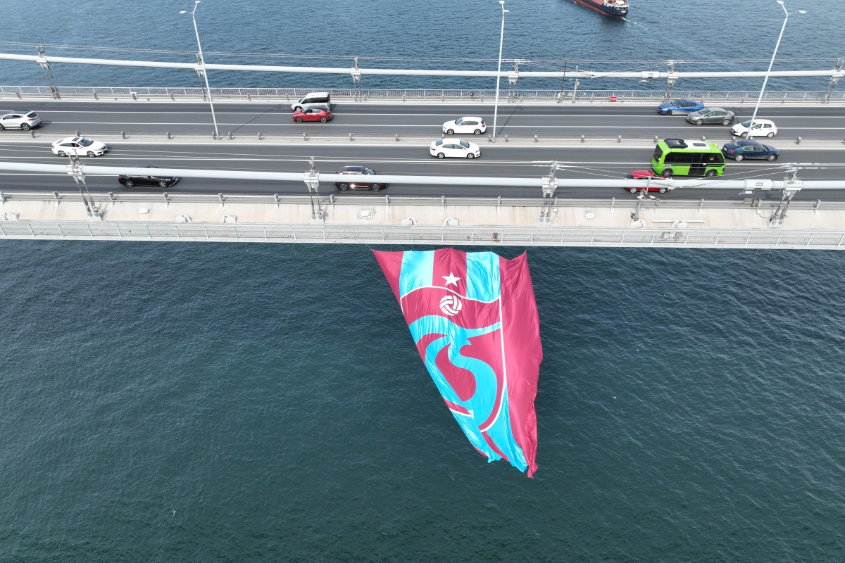 Süper Lig'de 2021-2022 sezonunda bitime 3 hafta kala şampiyonluğunu ilan eden Trabzonspor'un bayrağı 15 Temmuz Şehitler Köprüsü'ne asıldı. Bordo mavi renkli bayrağın dalgalandığı köprü dron ile havadan görüntülendi.