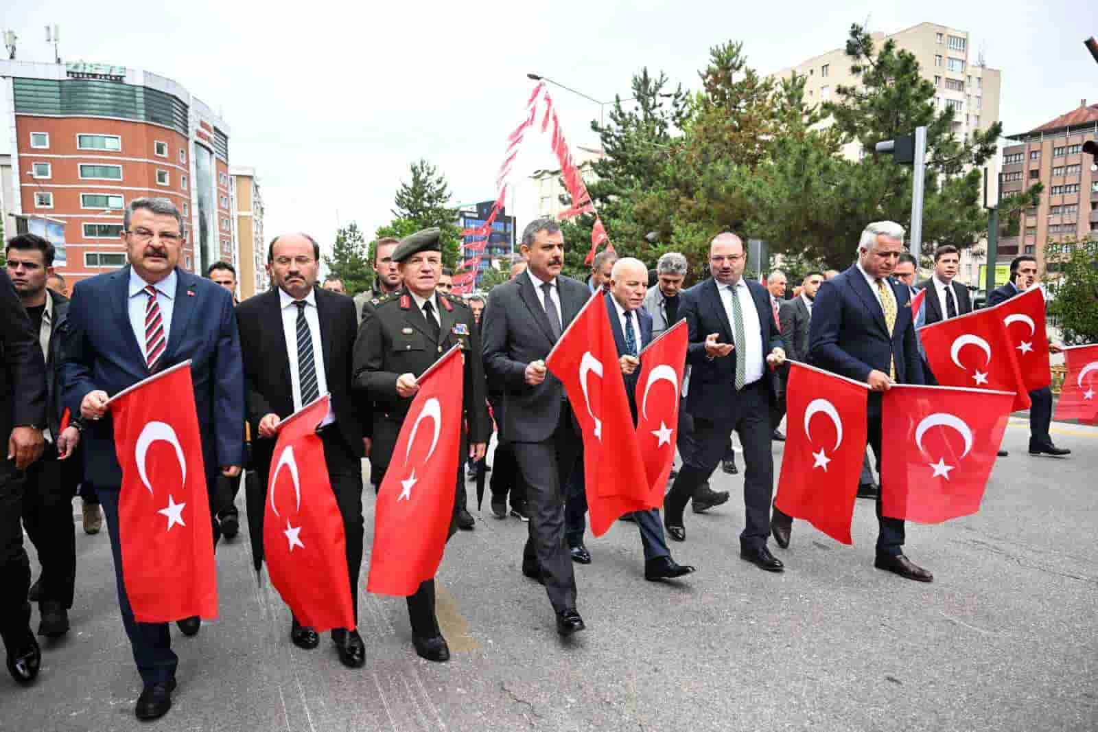 İstanbulkapı mevkiinde bir araya gelen öğrenciler, gaziler, vatandaşlar ve atlı cirit ekibi, Kolordu Komutanlığı Bölge Bandosu eşliğinde ellerinde Türk bayrakları ve Atatürk posterleriyle Havuzbaşı Kent Meydanı’na kadar yürüdü.