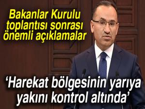 Bozdağ, Zeytin Dalı Harekatı'na ilişkin yaptığı açıklamada, Harekat kapsamında bugüne kadar PKK, KCK, PYD, YPG, DEAŞ terör örgütü mensubu 2 bin 795 terörist etkisiz hale getirilmiştir. Harekatın son 3 gününde etkisiz hale getirilen terörist sayısı 361 olmuştur. Harekat ile bugüne kadar 112si köy, 30u kritik nokta olmak üzere toplam 142 bölge kontrol altına alınmıştır. Bugüne kadar harekat alanında 702 kilometrekare alan kontrol altına alınmıştır. Harekatın toplam alanı bin 920 kilometrekare olduğu değerlendirildiğinde harekat bölgesinin yarıya yakını TSKnın kontrolü altına geçmiştir ifadelerini kullandı.