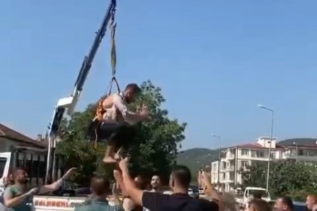 Haberal25 –Bursa'da düğün öncesi damadı vinç ile sallandırdılar. Arkadaşları ise damadın altında oyunlar oynadı.