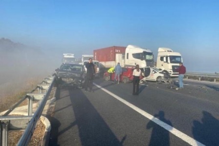 Kaza, sabah saatlerinde Bursa-Karacabey yolu üzerinde meydana geldi. Edinilen bilgiye göre, yoğun sisten dolayı görüş mesafesinin 10 metreye indiği yolda meydana gelen kazada aralarında tırlarında bulunduğu 10 araç birbirine girdi.