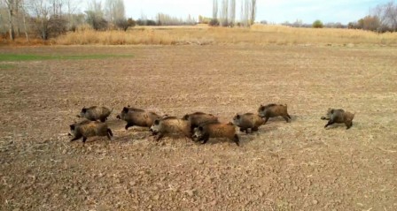 Mert Yılmaz, ilk kez bu kadar çok domuzu bir arada görüntülediğini ifade ederek dron ile uzun müddet sürüyü takip etti.