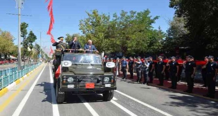 Hastaneler Caddesi'nde devam kutlama programlarında Vali Okay Memiş, 9. Kolordu Komutan Vekili Tuğgeneral Berat Acar ve Büyükşehir Belediye Başkanı Mehmet Sekmen askeri tören aracı ile alanı gezerek, vatandaşların bayramını kutladı.