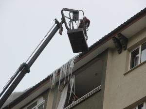 Güneşin yüzünü göstermesiyle birlikte eriyen karların oluşturduğu, 2 metreye kadar ulaşan buz sarkıtlarını itfaiye aracına çıkarak kıran ekibin çalışmaları, kent sakinlerine ve sürücülere rahat bir nefes aldırdı.