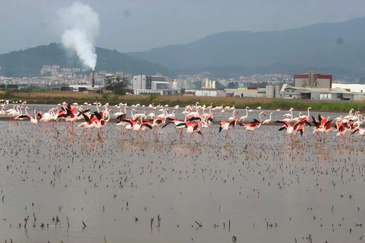 Her yıl olduğu gibi bu yıl da allı turna olarak bilinen flamingolar, Aydın’ın önemli tarım bölgelerinden Söke Ovası’na gelmeye başladı. Son günlerde etkili olan yağışların ardından su ile dolan tarlalara inen flamingolar eşsiz manzara oluştururken, Söke Ovası’nı şenlendirdi. İnce bacakları ve uzun boyunları ile tarlalarda balerin gibi süzülen flamingoların Söke Ovası’nda doğanın tüm güzelliğini ortaya çıkardığını ifade eden Ekosistemi Koruma ve Doğa Sevenler Derneği (EKODOSD) Başkanı Bahattin Sürücü, endüstriyel atıkların ve çevre sorunlarının habitat kaybına yol açtığına dikkat çekti.