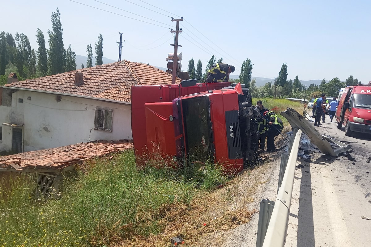 Çarpmanın etkisiyle kamyon yan yatarak yol kenarında bulunan Mehmet ve Elmas Akgönül çiftinin bahçesine yuvarlandı.