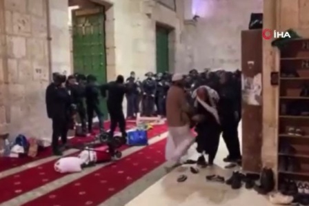 İsrail güçlerinin Mescid-i Aksa'ya yönelik baskınları devam ediyor. Teravih ve sabah namazlarının ardından İsrail güçleri, akşam saatlerinde Mescid-i Aksa'ya 3'üncü kez baskın düzenledi. Kıble Mescidi'ni basan İsrail güçleri, ibadet edenlere plastik mermi, göz yaşartıcı gaz ve copla saldırdı. Paniğe kapılan Müslümanlar hızla kendilerini Kıble Mescidi'nden dışarı atarken, bazıları ise İsrail güçlerine karşılık verdi.