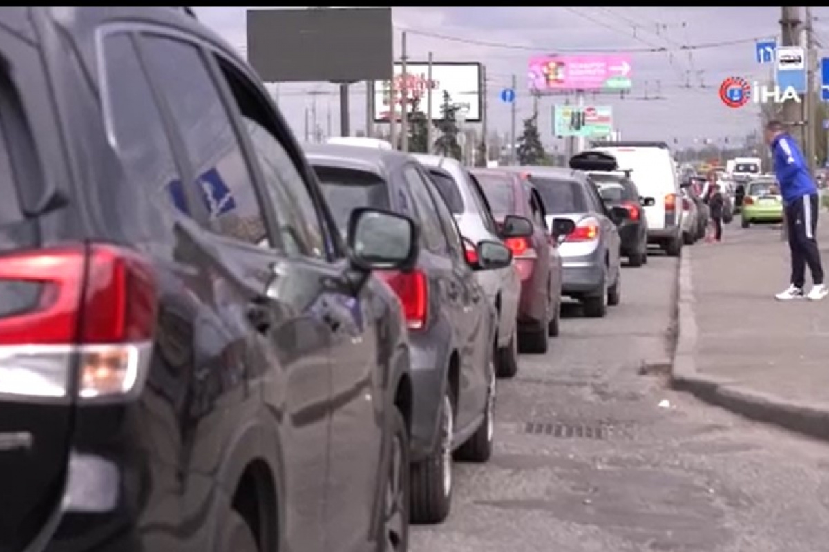 Ukrayna’nın başkenti Kiev’de akaryakıtın azalması nedeniyle halk, akaryakıt istasyonlarında uzun kuyruklar oluşturdu.