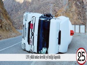 (HABERAL25) - Erzurumun Oltu ilçesinde keskin virajı alamayan LPG yüklü tanker devrildi. Kazanın ardından yol trafiğe kapatıldı.