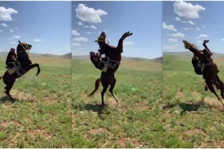 Haberal25 –Erzincan’ın Tercan ilçesinde sırtına binilmesiyle hırçınlaşarak şaha kalkan at, sırt üstü yere çakıldı. Üzerindeki muhtarın düşme anı saniye saniye cep telefonu kamerasına yansıdı. Muhtar ölümden döndü.
