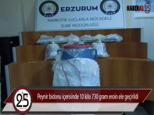Edinilen bilgiye göre, Aşkale uygulama noktasında şüphe üzerine durdurulan bir seyahat firmasına ait yolcu otobüsünde arama yapıldı. Bagaj kontrolleri sırasında F.M. isimli şansında bagajında yapılan aramada peynir bidonu içerisinde peynirlerin altına zulalanmış 10 paket şeklinde 10 Kilo 730 gram eroin maddesi ele geçirildi.