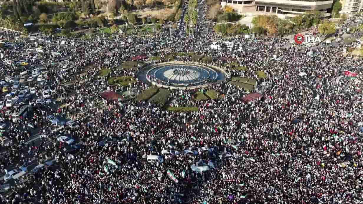 Haberal25-Suriyeliler, cuma namazının ardından başkent Şam’ın simgesi Emevi Meydanı'na akın ederken, meydan hıncahınç doldu.