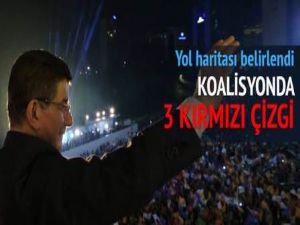 AK Parti seçim sonuçlarına ilişkin ilk değerlendirmelerini yaparken, yol haritası da şekillenmeye başladı. Önceki gece yapılan toplantılarda AK Parti'nin ağır toplarının bundan sonra yapılacaklar konusunda kafa karışıklığı olmadığını ve sandığın mesajının alındığını vurguladığı öğrenildi. 13 yıldır, her dönemde milli irade vurgusu yapan AK Parti, bir kez daha milli irade diyecek ve sandık mesajının gereğini yapacak. Sandıktan çıkan ilk sonucun "uzlaşma ve koalisyon" mesajı olduğu değerlendirildi. Bu mesajın gereğinin yapılacağı kaydedildi. Edinilen bilgilere göre, AK Parti kavgacı bir görüntü vermeyecek ve koalisyon için tüm partilerle görüşecek. Ancak bu görüşmelerde 3 temel kırmızı çizgiden asla taviz verilmeyecek. Koalisyon görüşmelerinde "Paralel yapı ile mücadeleden taviz verilemez. Çözüm iradesi devam ettirilmeli. Yüzde 52 halkoyları ile seçilmiş ilk Cumhurbaşkanı olan Tayyip Erdoğan'ın konumu ve meşruiyeti asla tartışılamaz" vurgusu yapılacak. Görüşmeler sonunda koalisyon şekillenmezse "Erken seçim" çağrısı yapılacak.