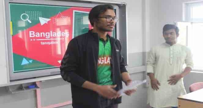 Haberal25-Erzurum Atatürk Üniversitesinde okuyan Filistin, Suriye, Gine ve Bangladeş'ten gelen uluslararası öğrenciler ülkelerini Yahya Kemal Ortaokulunda okuyan ortaokul öğrencilerine tanıttılar.