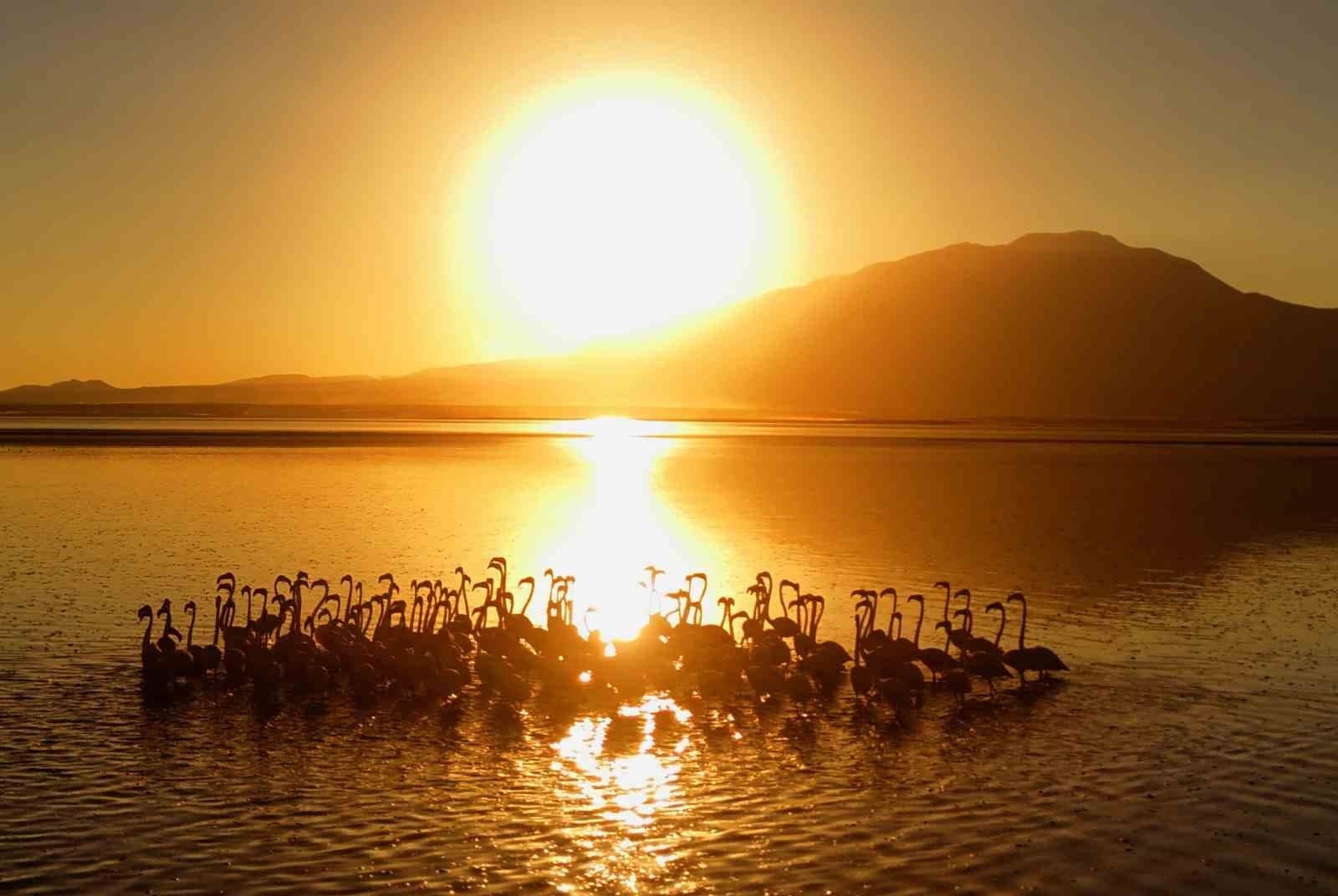 Van Gölü’nün sığ alanlarını beslenme ve dinlenme noktası olarak tercih eden flamingolar, akşam saatlerinde güneşin batışıyla birlikte görsel bir şölen sundu. Özellikle gökyüzünün kızıl tonlarıyla birleşen manzara, Süphan Dağı’nın silueti eşliğinde adeta kartpostallık görüntüler oluşturdu.