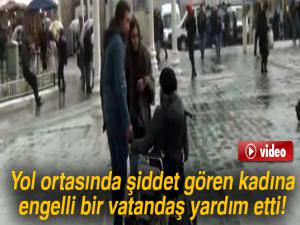 Akülü arabasıyla kadına şiddete engel olmaya çalışan engelli Taner Yılmaz vatandaşların duyarsızlığından rahatsız olduğunu söyledi. Tesadüfen olayı gördüğünü açıklayan Yılmaz, Bugün buraya arkadaşlarımla buluşmak için geldim. Aşağı arabamı bırakıp meydana çıktım. Arkadaşları itişirken gördüm. Kimse müdahale etmedi, gidip vurayım dedim. İnsanlar hiç tepki vermedi, şaşırdım. Bir polisin dışında kimse gelmedi dedi.